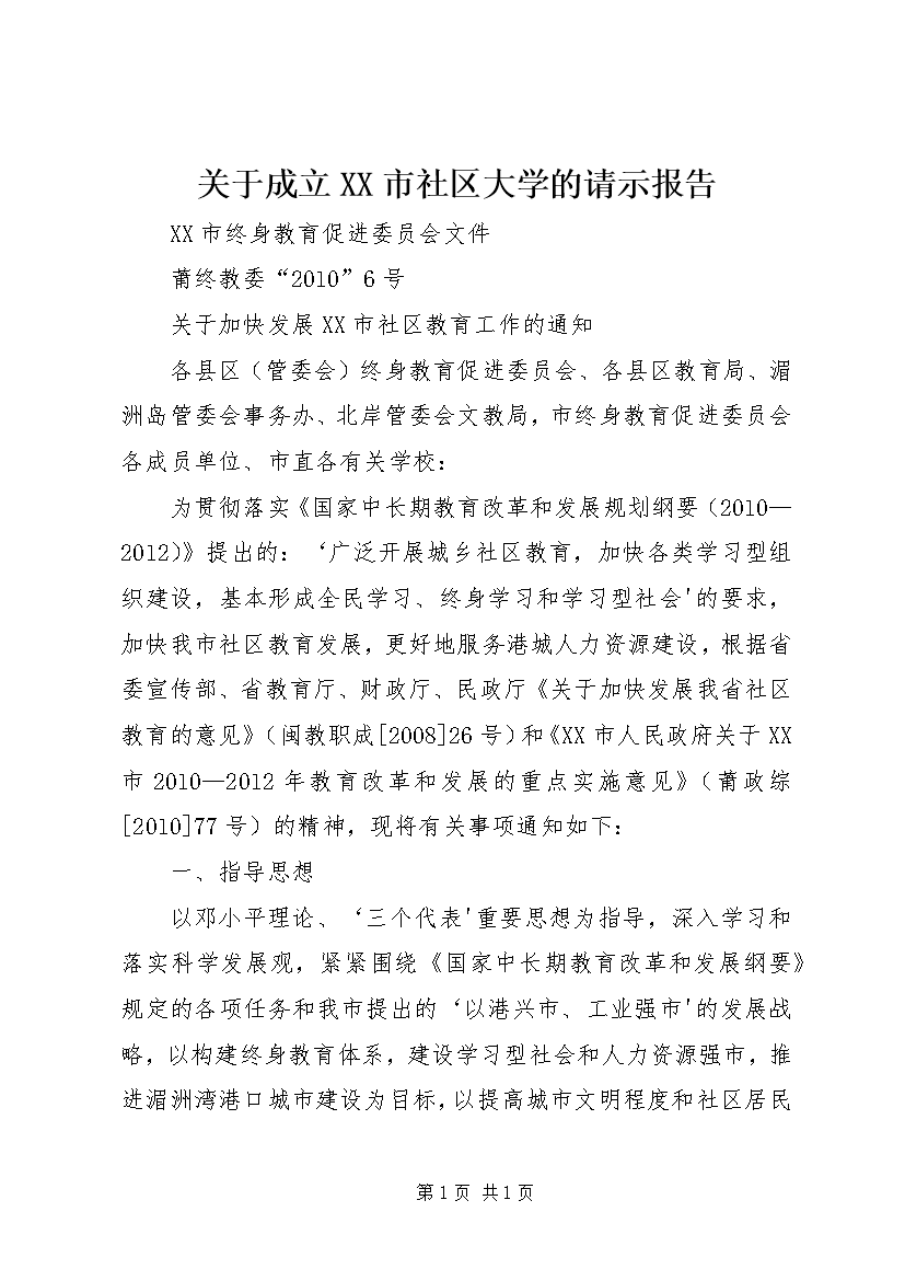 关于成立XX市社区大学的请示报告