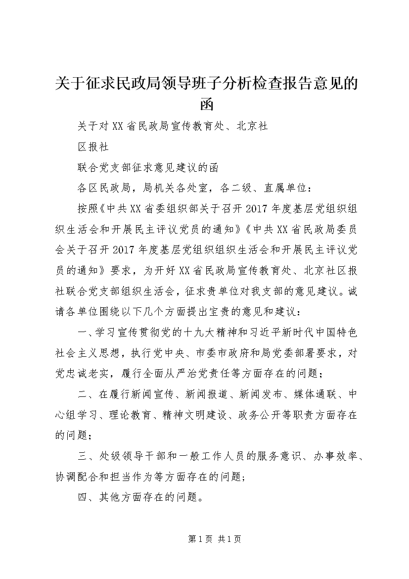 关于征求民政局领导班子分析检查报告意见的函 (2)
