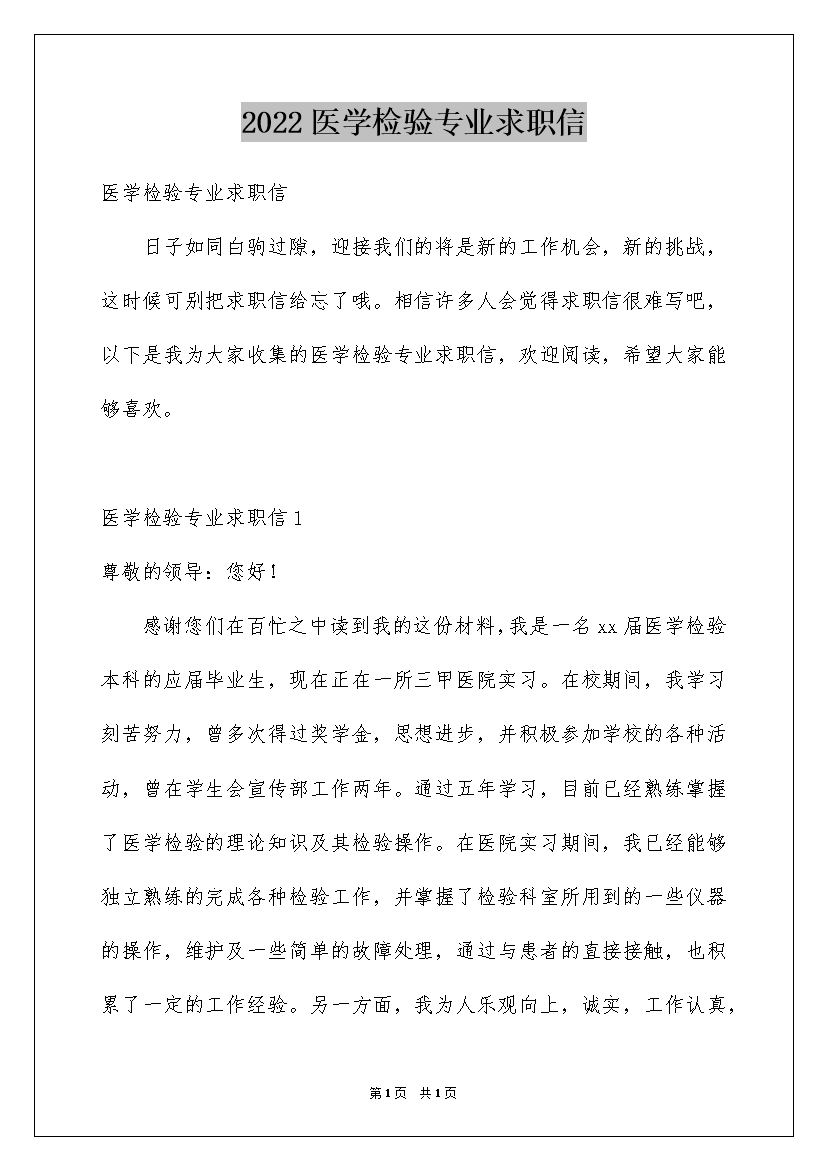 2022医学检验专业求职信