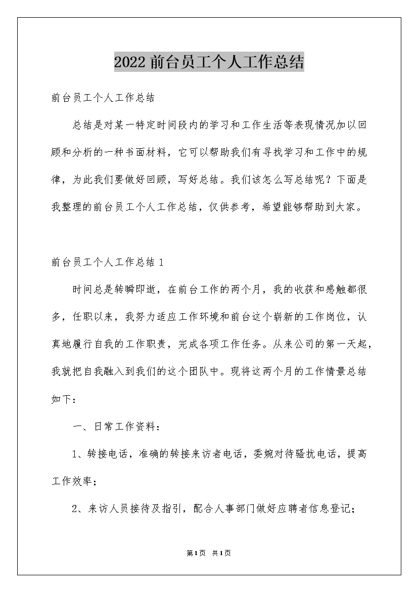 2022前台员工个人工作总结