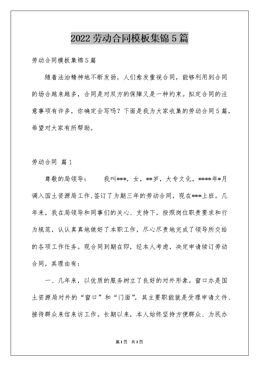2022劳动合同模板集锦5篇