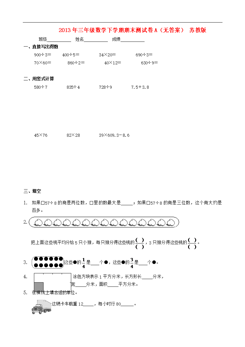 试题-全国-2013_2013年三年级数学下学期期末测试卷A(无答案) 苏教版