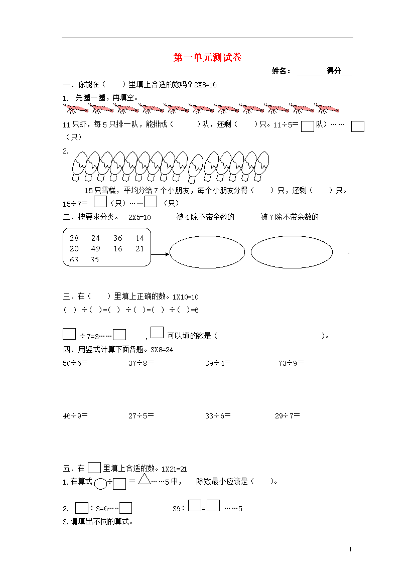 试题-全国-2016_二年级数学下册 第一单元 试卷(无答案) 苏教版
