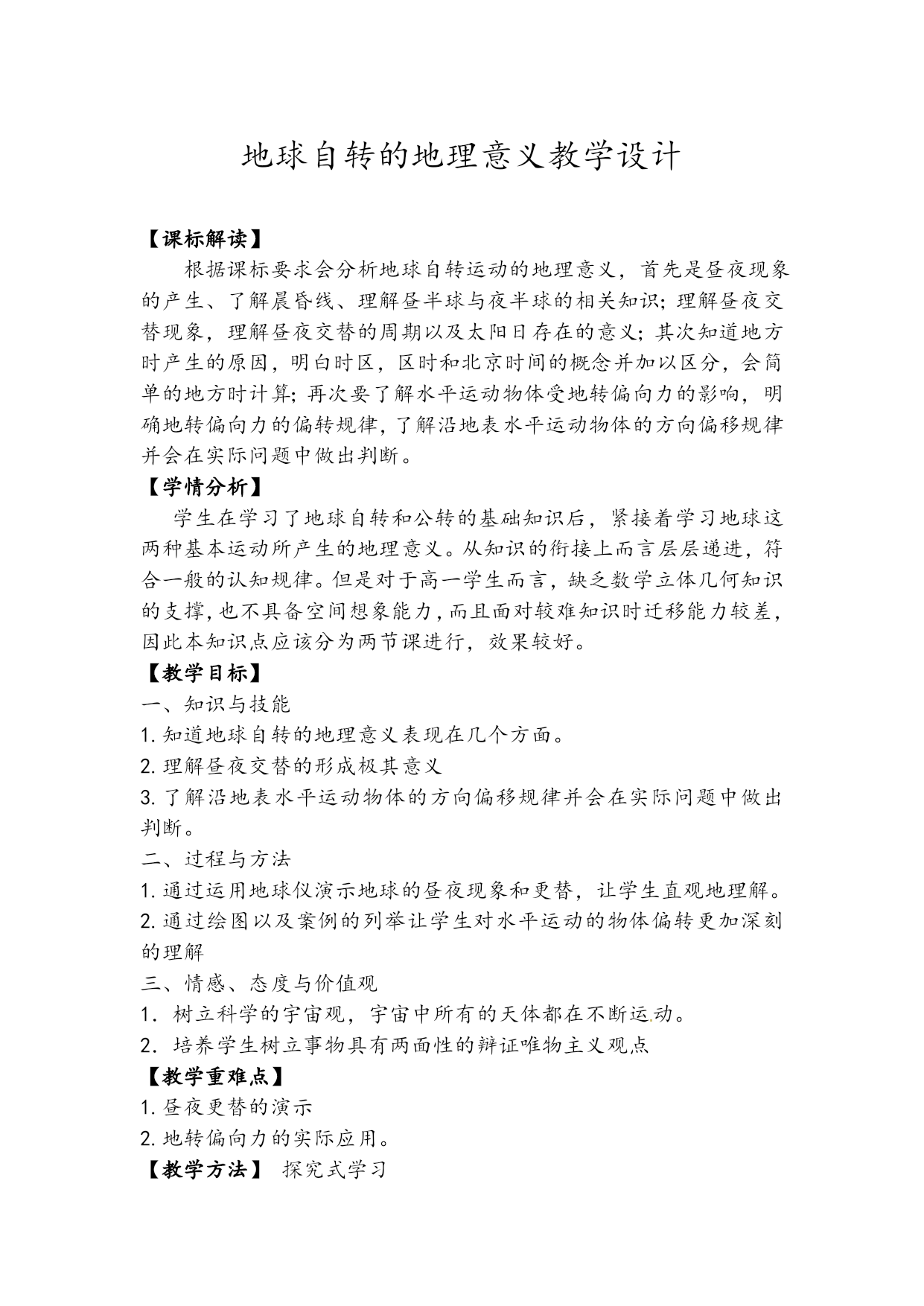 地球自转的地理意义教学设计