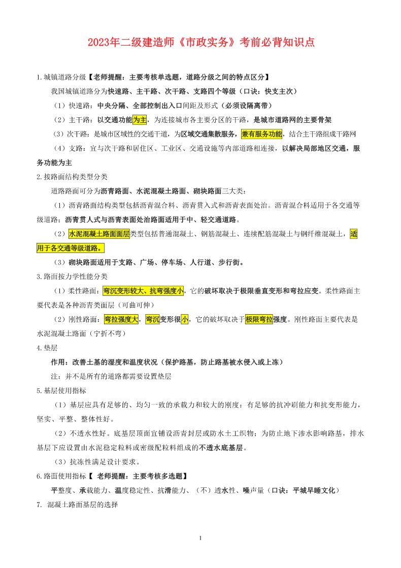 2023年一级建造师《市政实务》考前必背知识点汇总