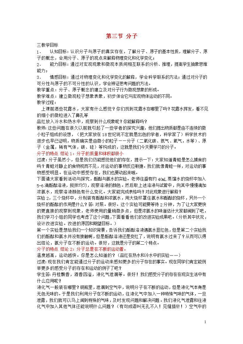 教案-全国-2015_九年级化学上册 第3章 第3节《分子》教案2 (新版)北京课改版