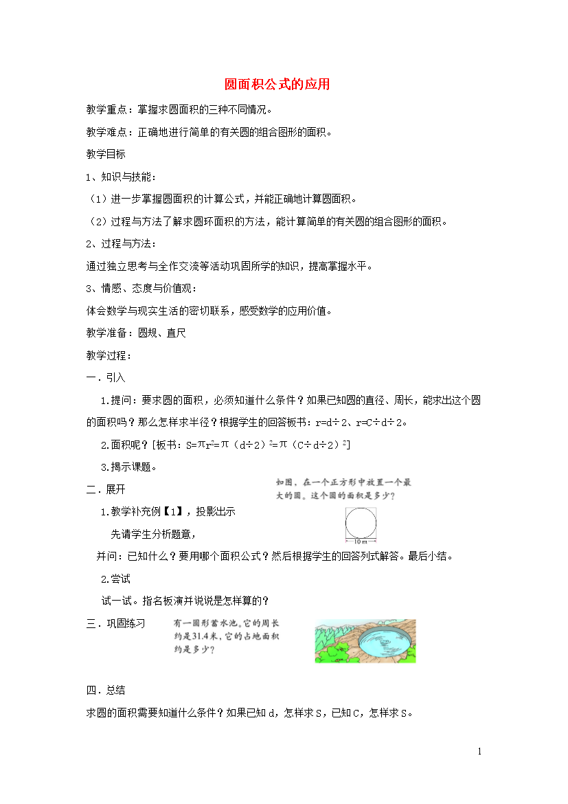 教案-全国-2019_六年级数学上册 第一单元 圆 圆面积公式的应用教案 北师大版