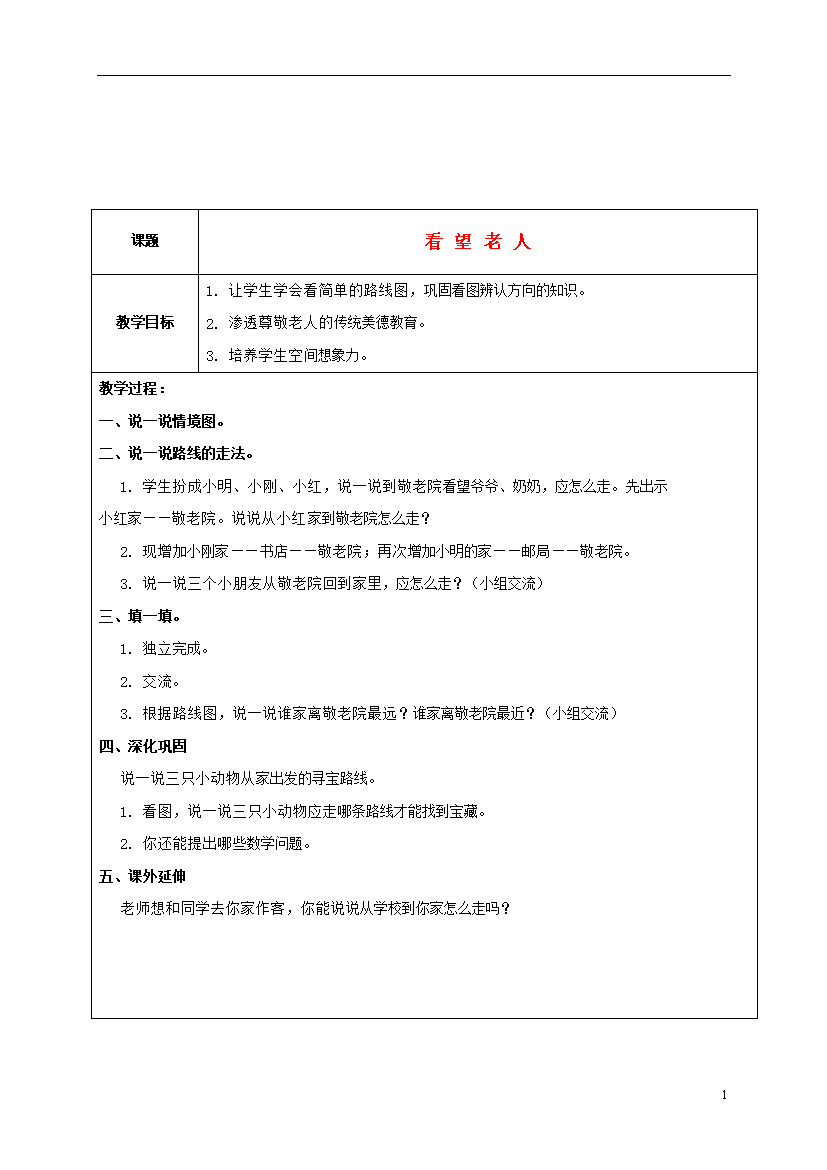 教案-全国-2011_二年级数学上册 看望老人 2教案 北师大版
