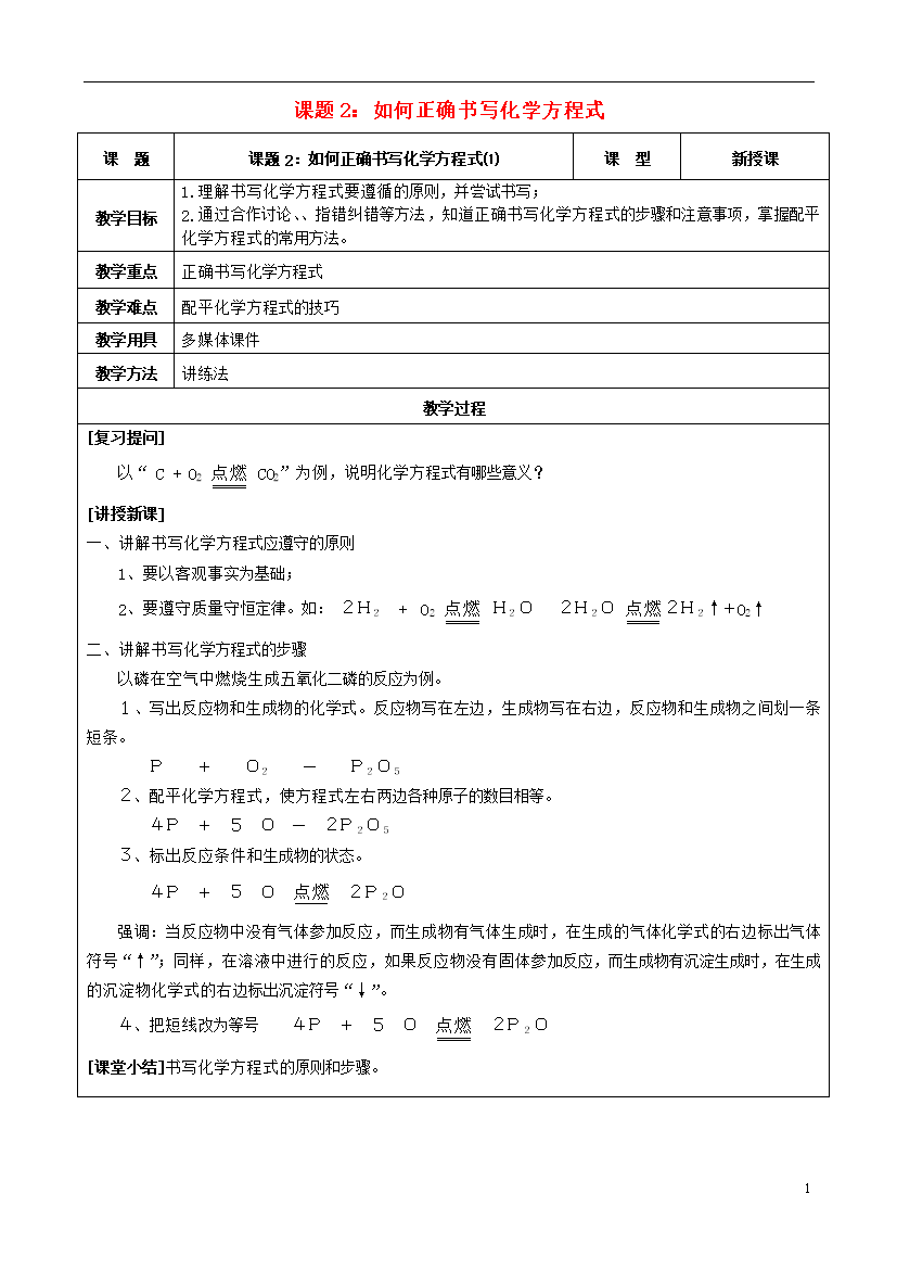 教案-全国-2013_九年级化学上册 第五单元 化学方程式 课题2 如何正确书写化学方程式教案 新人教版