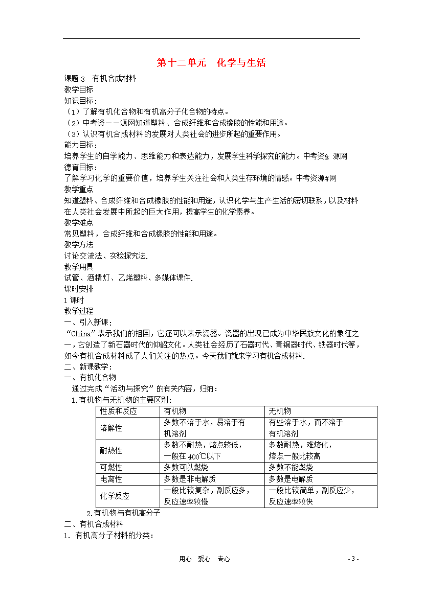 教案-全国-2011_九年级化学下册 第十二单元课题3 有机合成材料 教案 人教新课标版