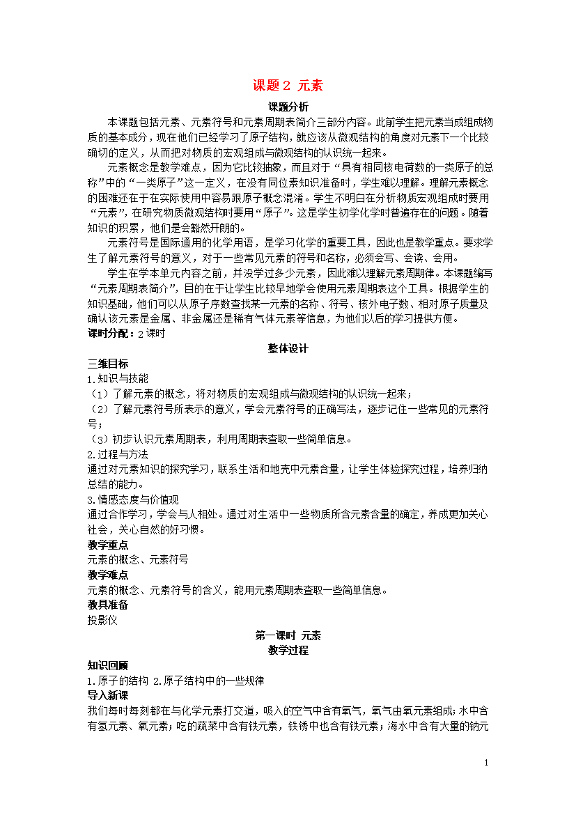 教案-全国-2013_(新课标)2013年九年级化学上册 第四单元 物质构成的奥秘 课题 2 元素优秀教案 新人教版