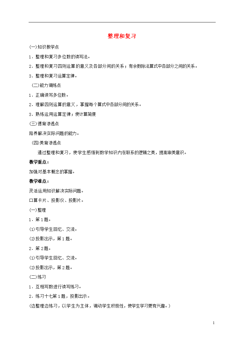 教案-全国-2012_四年级数学下册 整理和复习教案 人教版