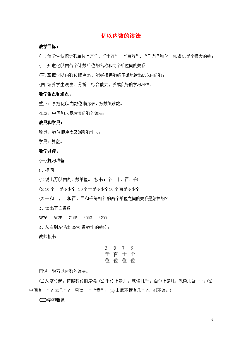 教案-全国-2012_四年级数学上册 亿以内数的读法 4教案 人教版