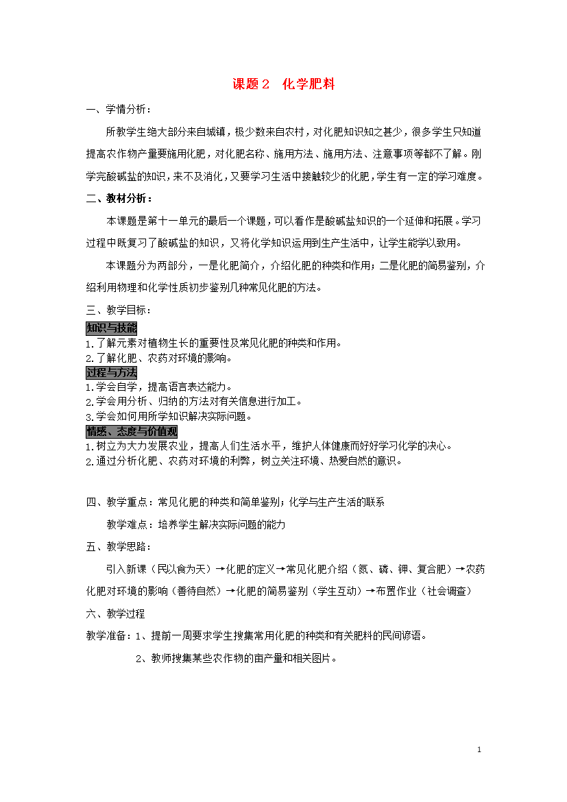 教案-全国-2019_2019春九年级化学下册 第十一单元 盐 化肥 课题2 化学肥料教案 (新版)新人教版