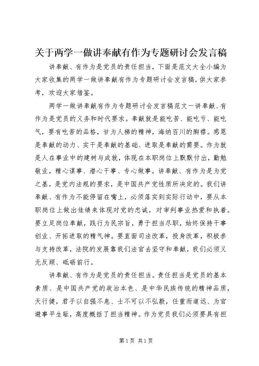 关于两学一做讲奉献有作为专题研讨会发言稿