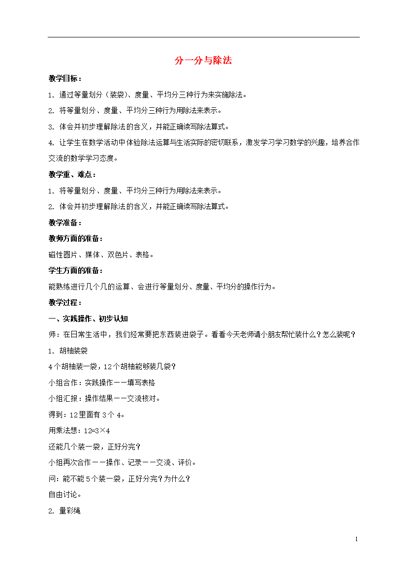 教案-全国-2011_二年级数学上册 分一分与除法教案 沪教版