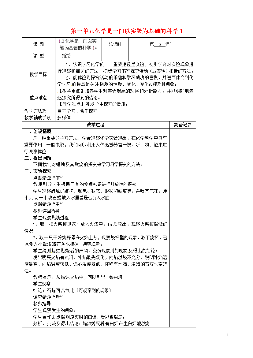 教案-江苏-2014_江苏省南京市上元中学九年级化学上册 第一单元化学是一门以实验为基础的科学教案1 (新版)新人教版