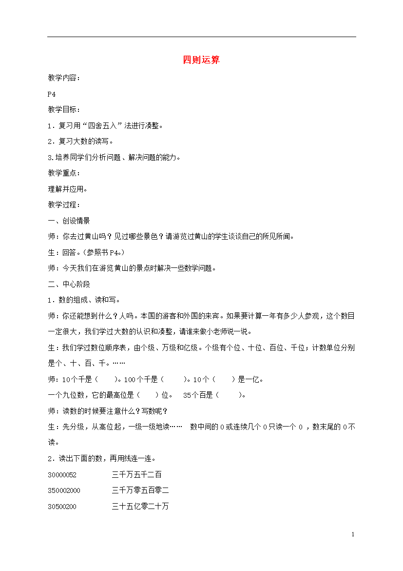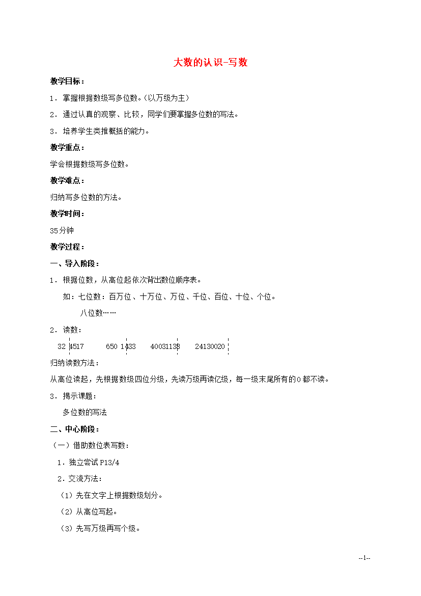 教案-全国-2011_四年级数学上册 大数的认识-写数 1教案 沪教版