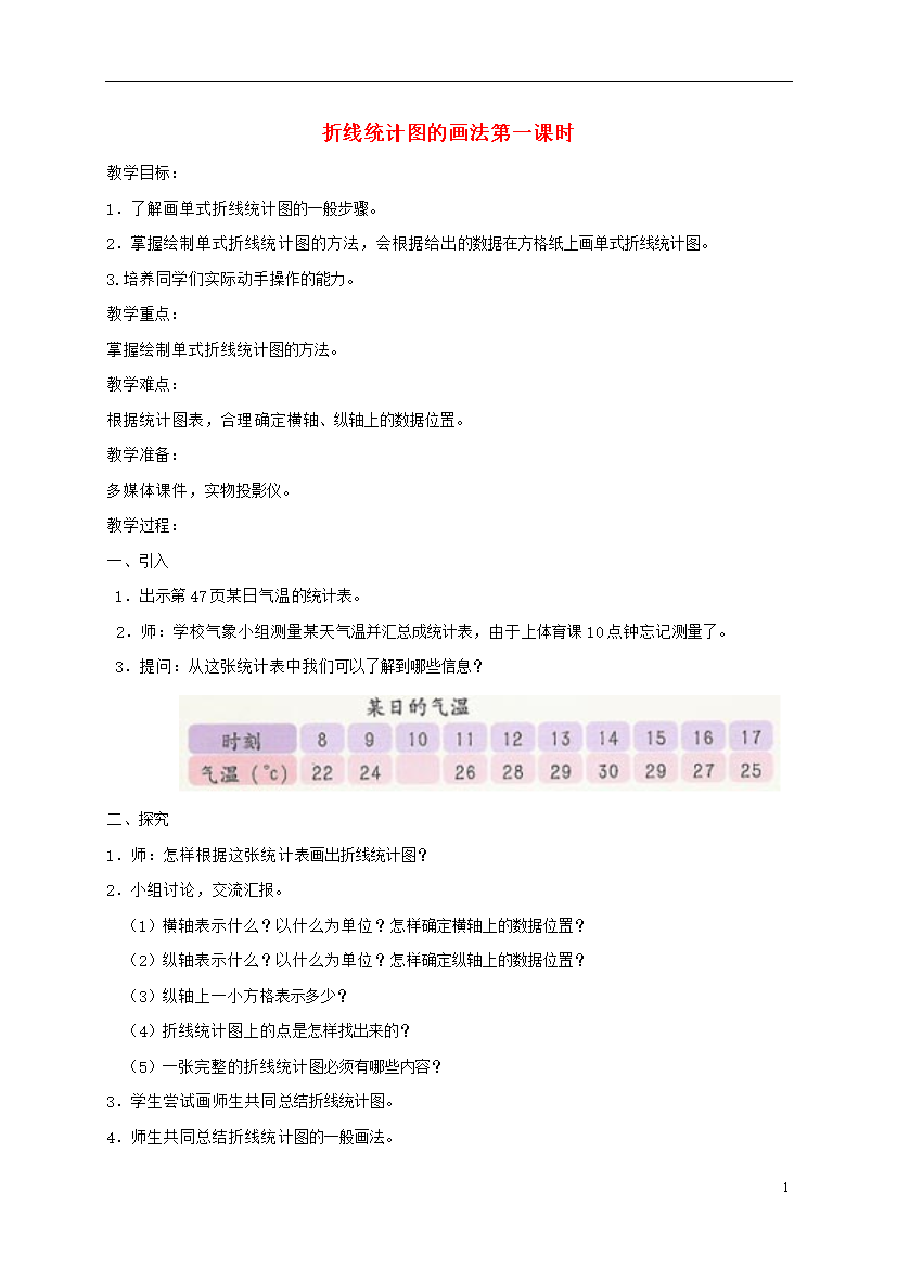 教案-全国-2012_四年级数学下册 折线统计图的画法第一课时1教案 沪教版