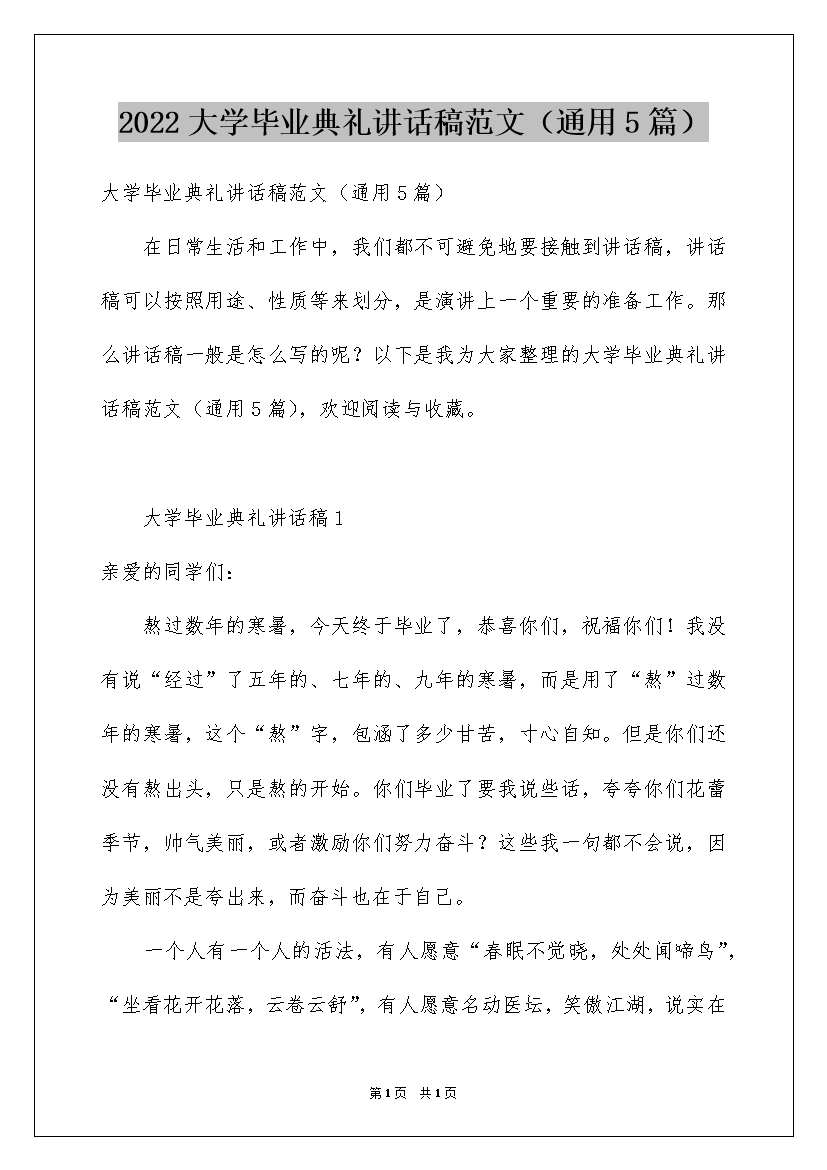 2022大学毕业典礼讲话稿范文(通用5篇)
