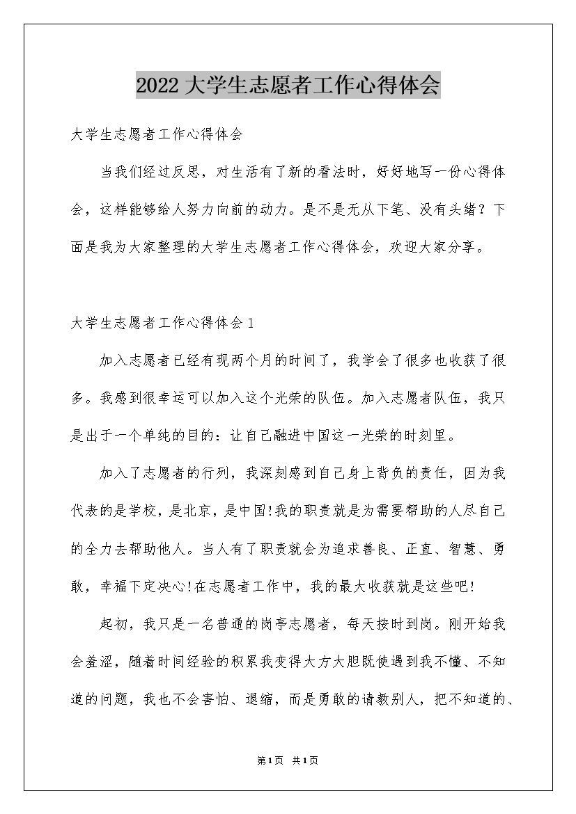 2022大学生志愿者工作心得体会