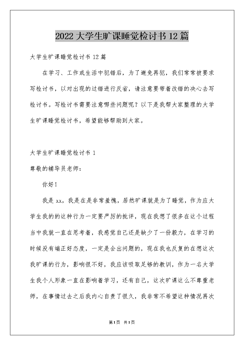 2022大学生旷课睡觉检讨书12篇