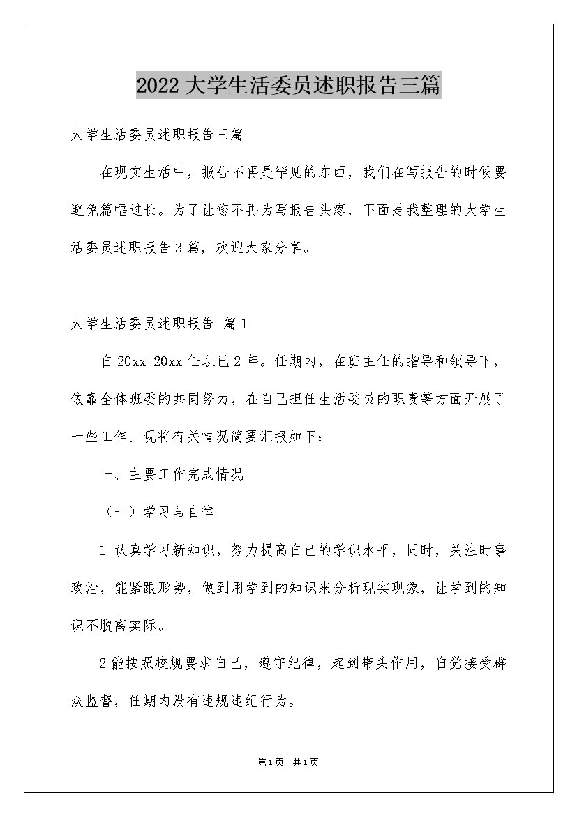 2022大学生活委员述职报告三篇
