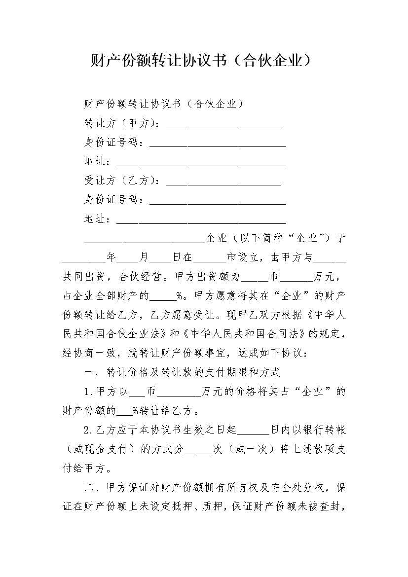 财产份额转让协议书(合伙企业)