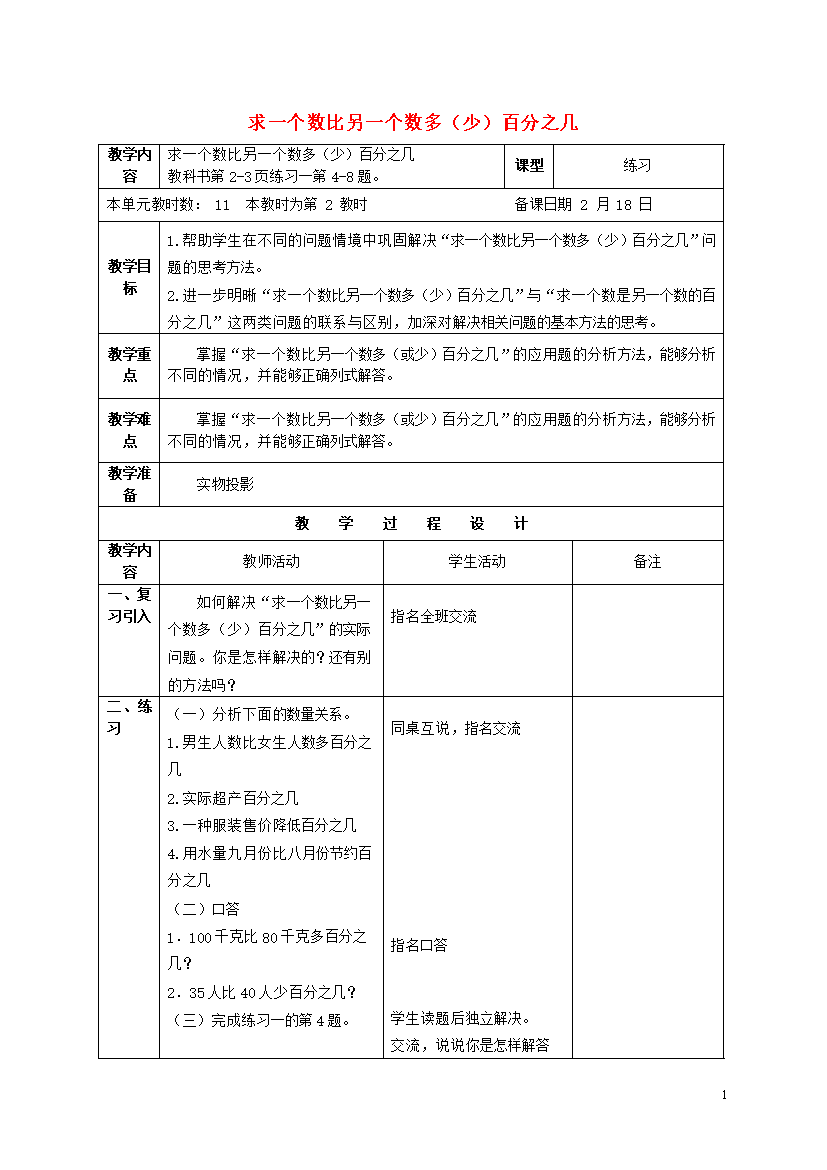 教案-全国-2011_六年级数学下册 求一个数比另一个数多(少)百分之几的练习课教案1 苏教版