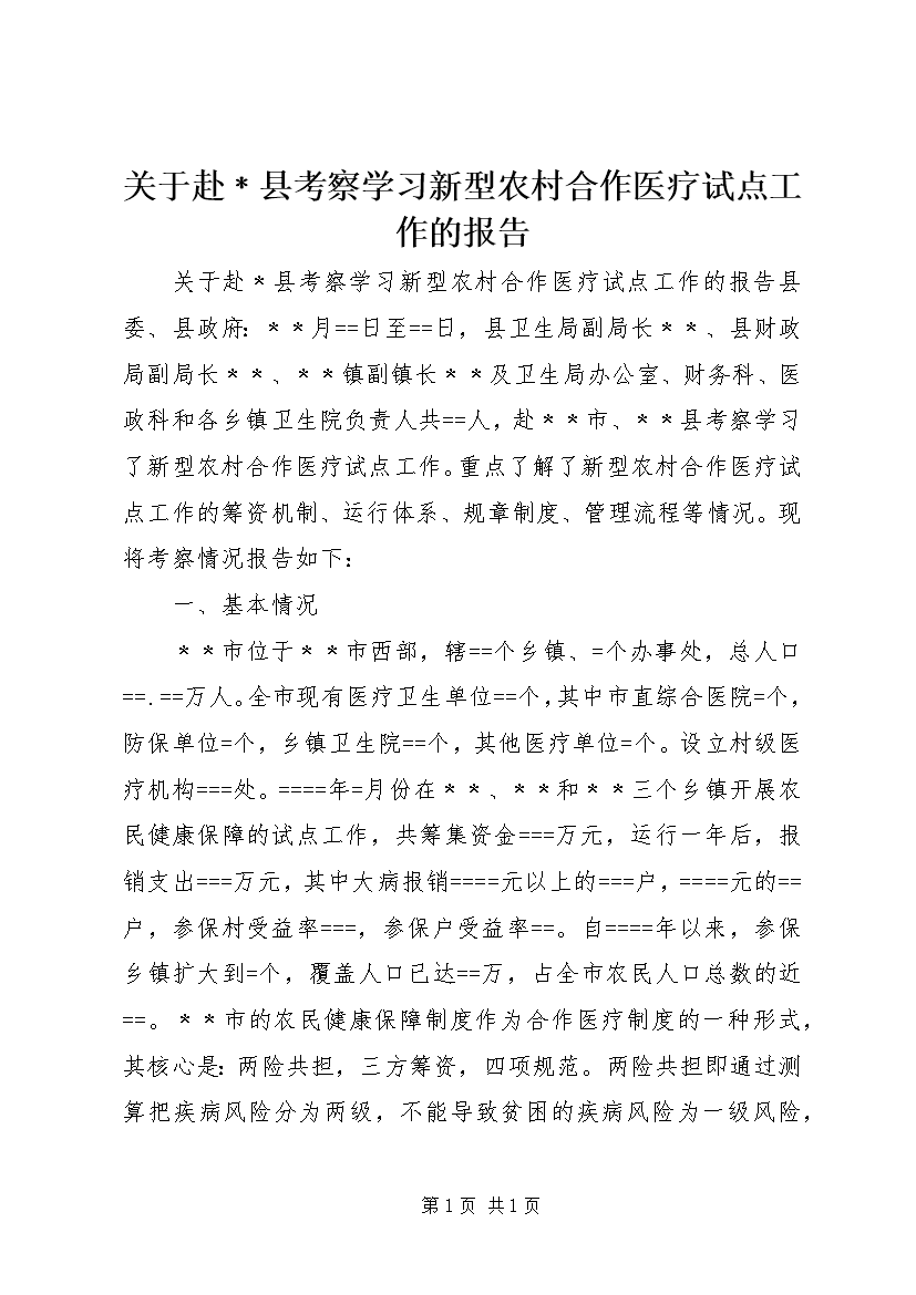 关于赴﹡县考察学习新型农村合作医疗试点工作的报告