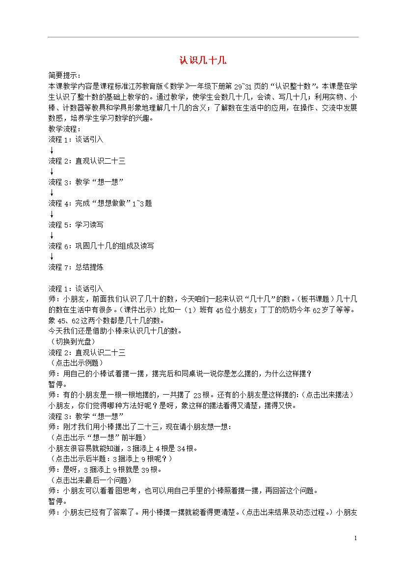 教案-全国-2012_一年级数学下册 认识几十几3教案 苏教版