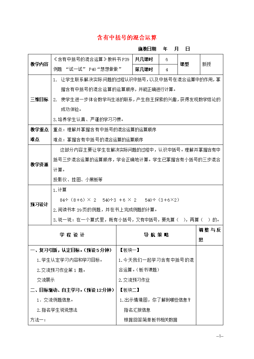 教案-全国-2011_四年级数学下册 含有中括号的混合运算教案2 苏教版