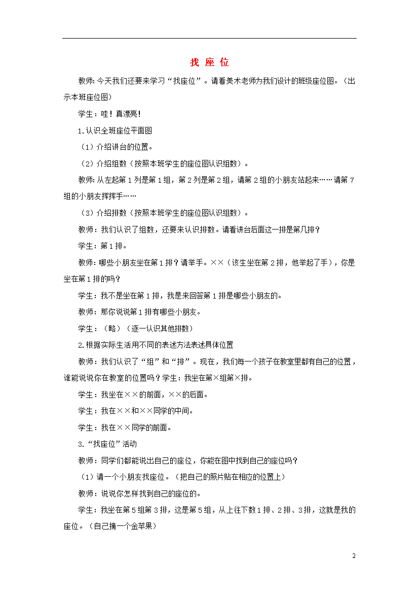 教案-全国-2017_2017春一年级数学下册 2《位置》找座位教案2 (新版)西师大版