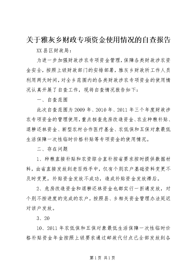 关于雅灰乡财政专项资金使用情况的自查报告_1
