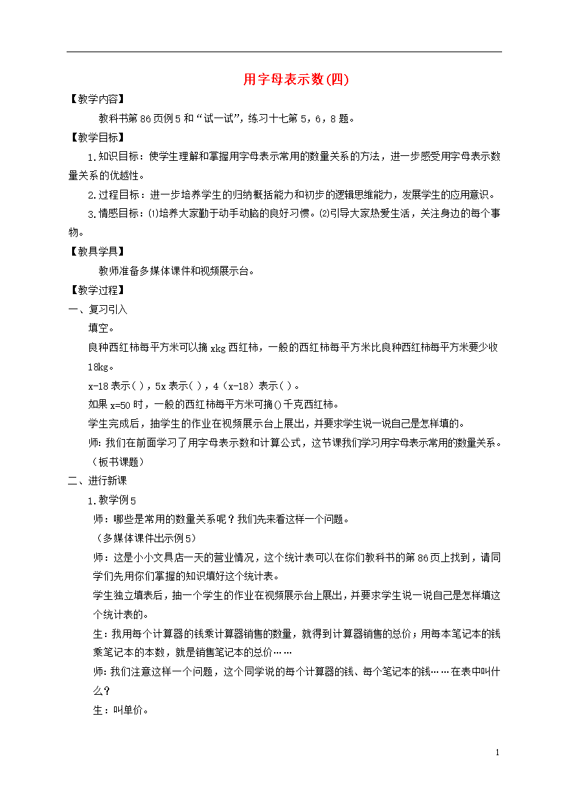 教案-全国-2012_五年级数学下册 用字母表示数4教案 西师大版