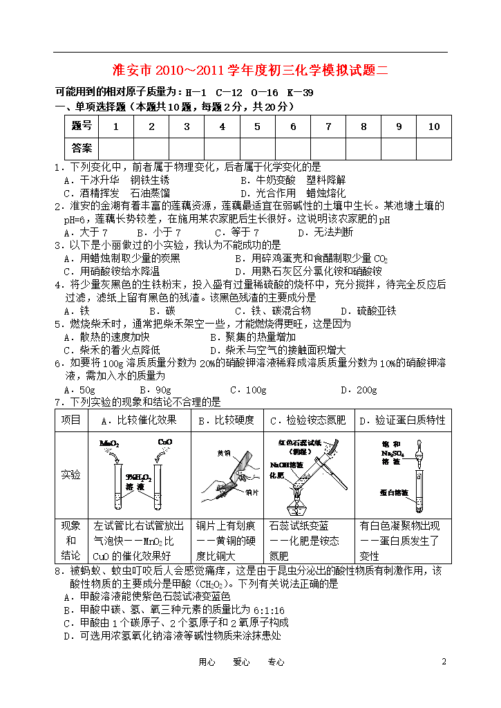 试题-江苏-2011_江苏省淮安市2010~2011学年度中考化学模拟试题 上教版
