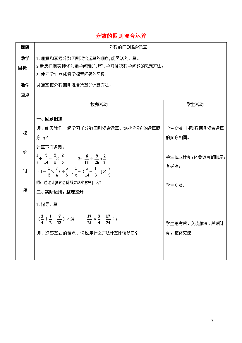 教案-全国-2011_五年级数学上册 分数的四则混和运算教案 青岛版五年制