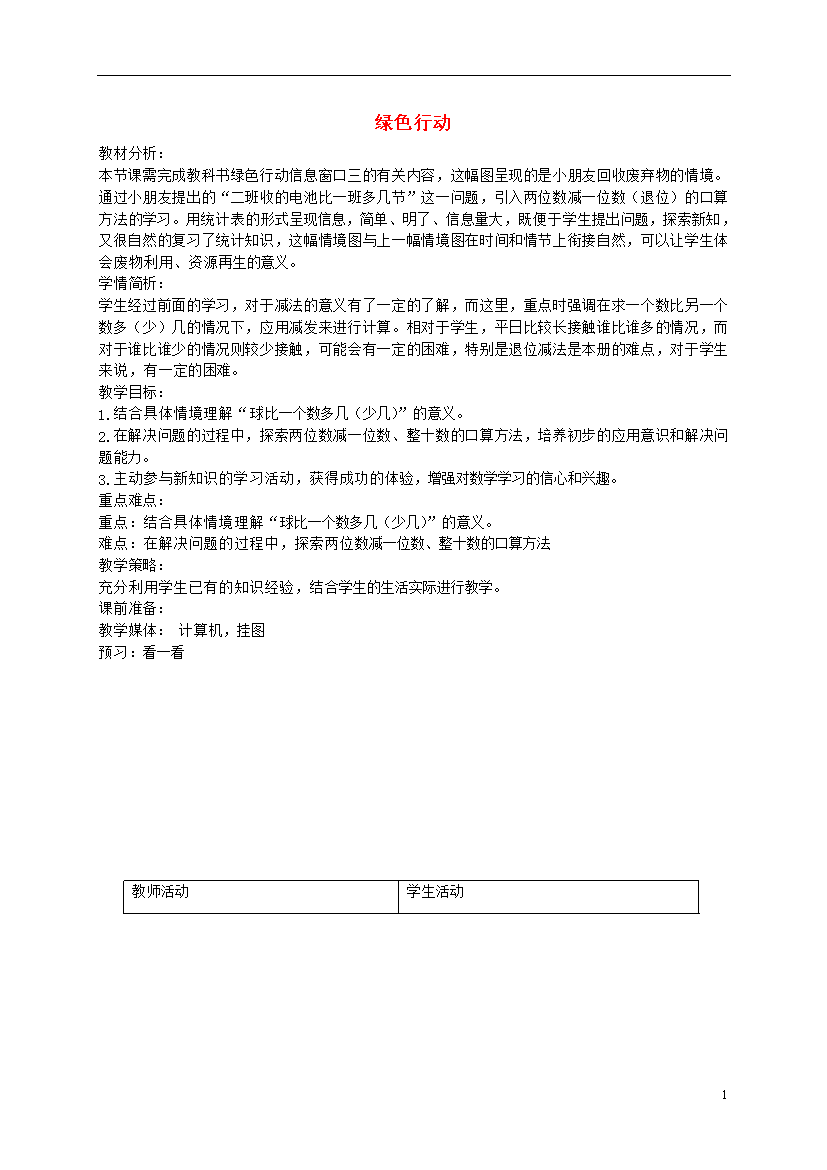 教案-全国-2012_一年级数学下册 绿色行动8教案 青岛版五年制