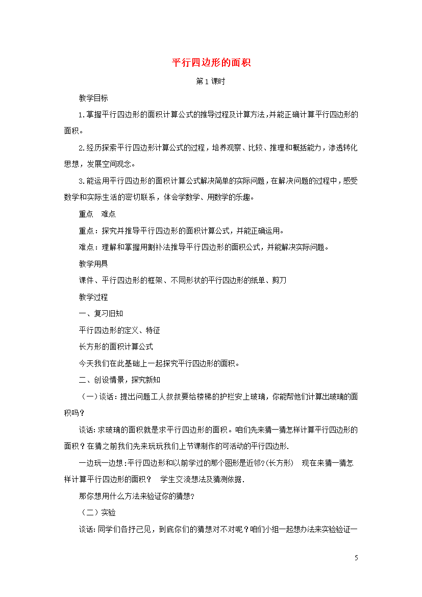 教案-全国-2019_五年级数学上册 第五单元信息窗1《平行四边形的面积》教案 青岛版