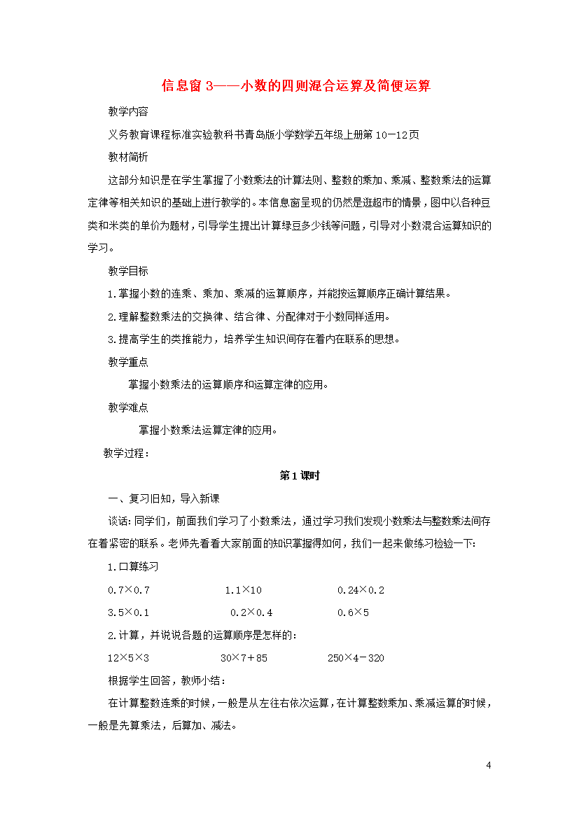 教案-全国-2019_五年级数学上册 第一单元信息窗3《小数的四则混合运算及简便运算》教案 青岛版