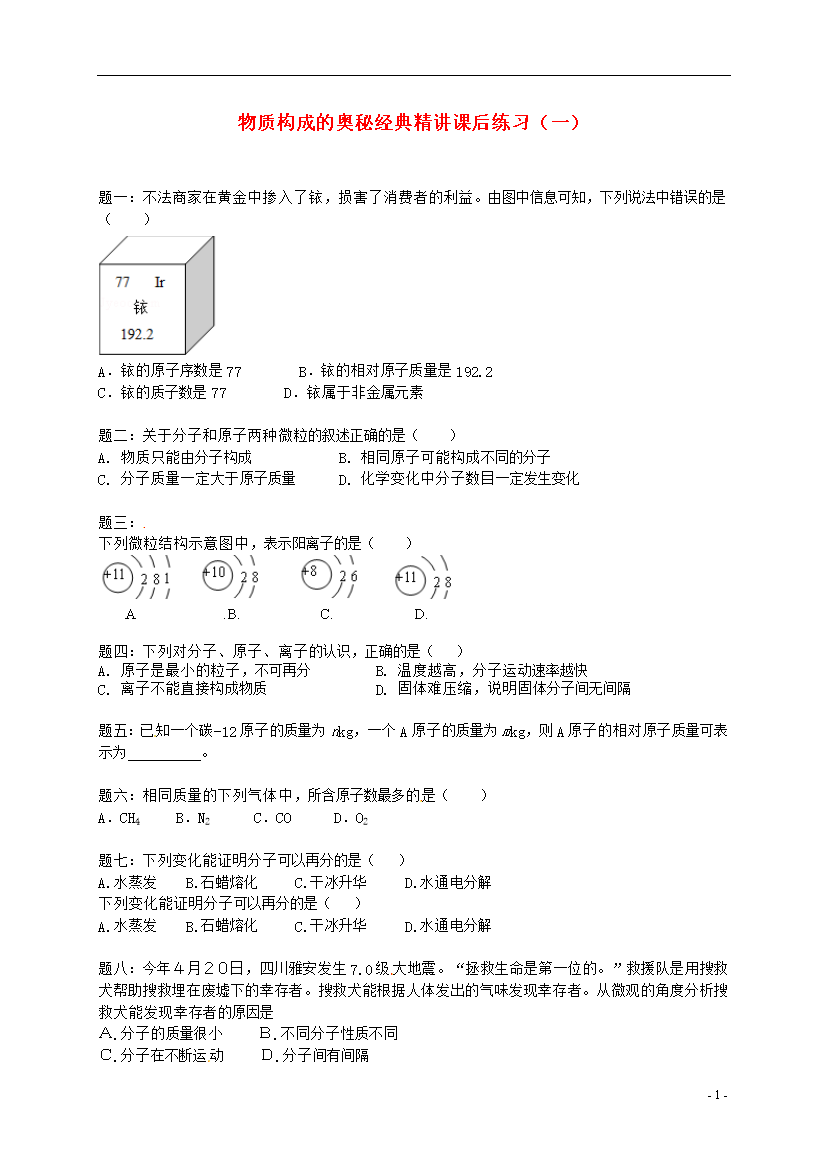 试题-全国-2014_2014届中考化学二轮复习 物质构成的奥秘经典精讲课后训练一