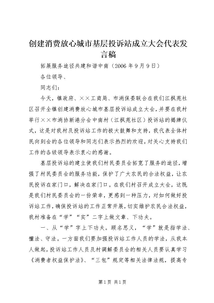 创建消费放心城市基层投诉站成立大会代表发言稿 (6)
