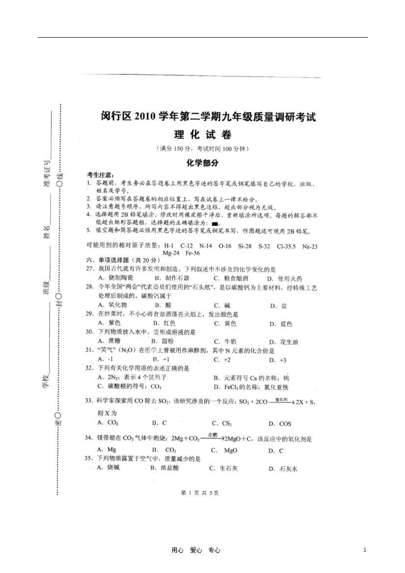 试题-上海-2011_上海闵行区2010学年九年级化学第二学期质量调研考试(扫描版,无答案)