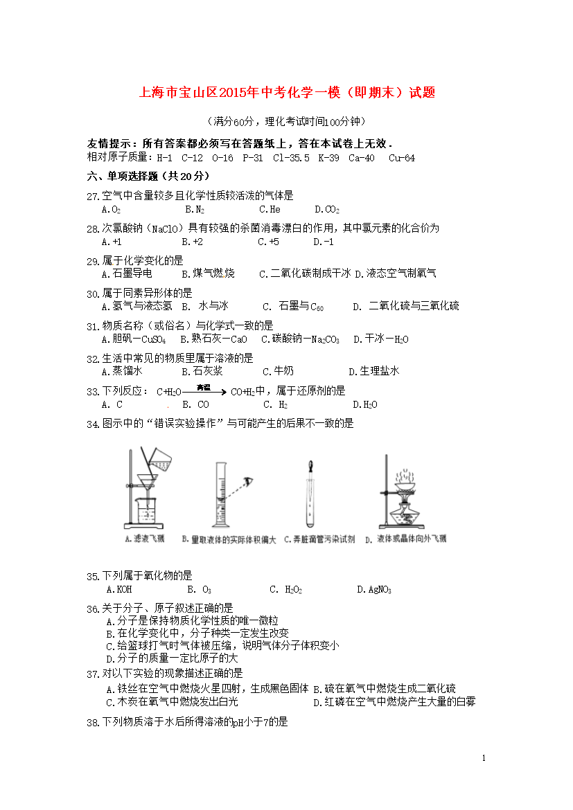 试题-上海-2015_上海市宝山区2015年中考化学一模(即期末)试题