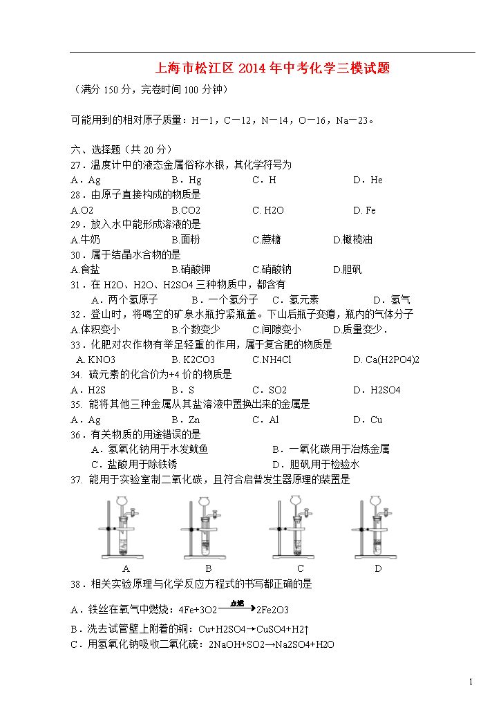 试题-上海-2014_上海市松江区2014年中考化学三模试题