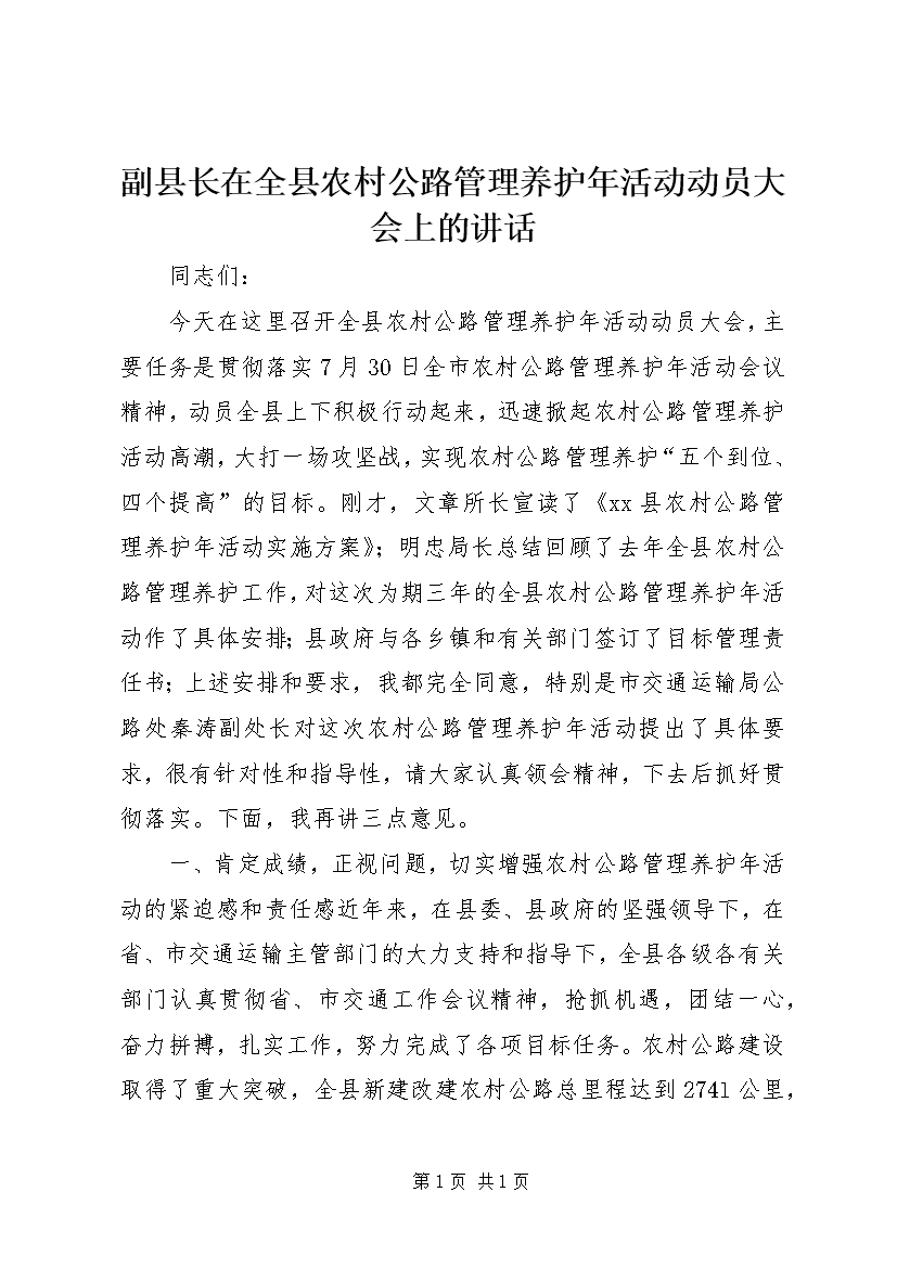 副县长在全县农村公路管理养护年活动动员大会上的讲话 (2)