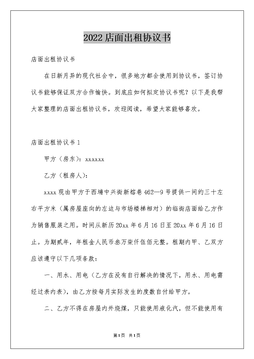2022店面出租协议书