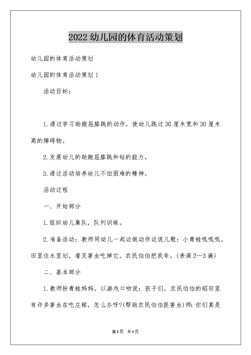 2022幼儿园的体育活动策划