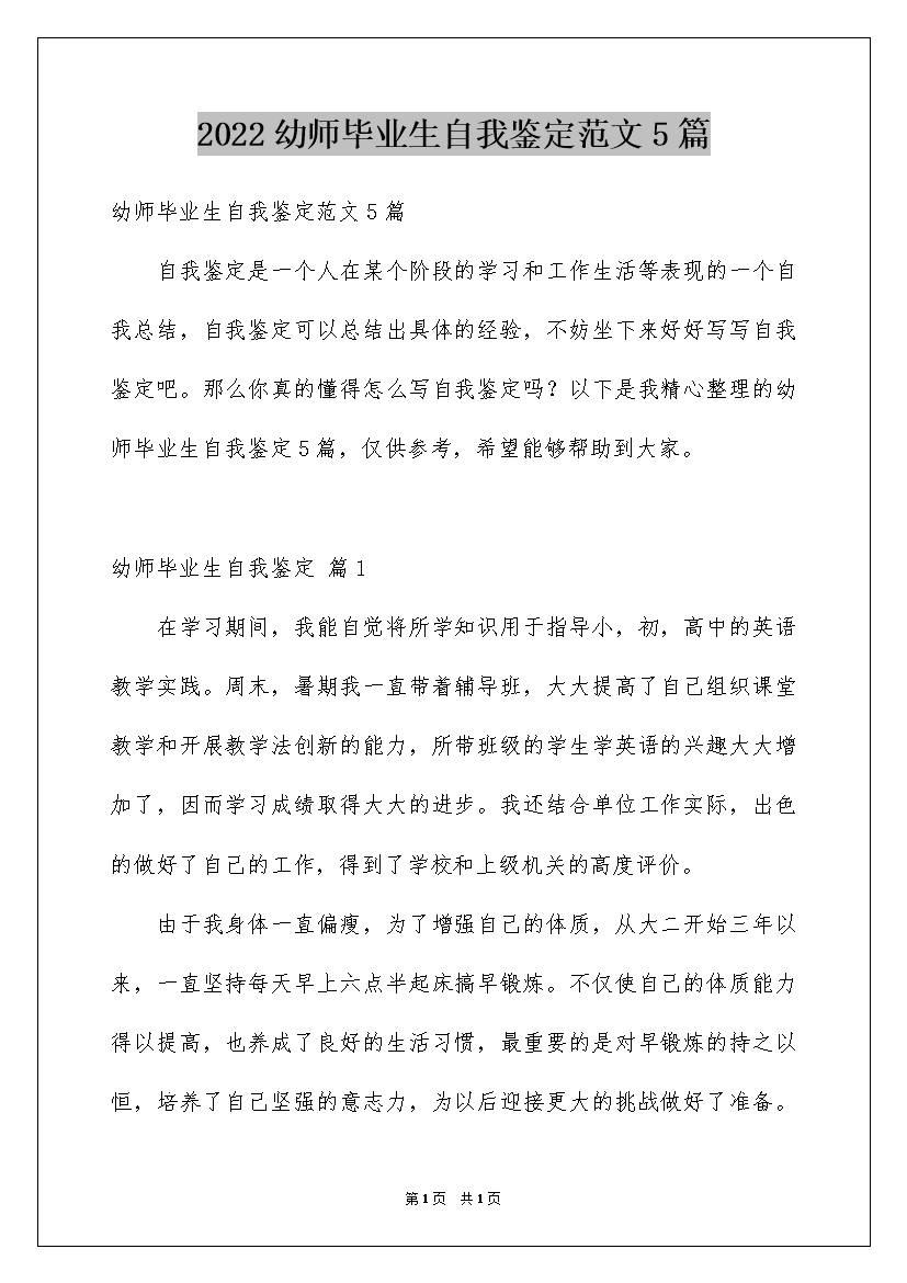 2022幼师毕业生自我鉴定范文5篇