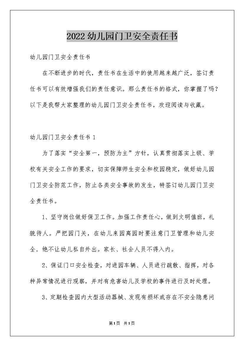 2022幼儿园门卫安全责任书
